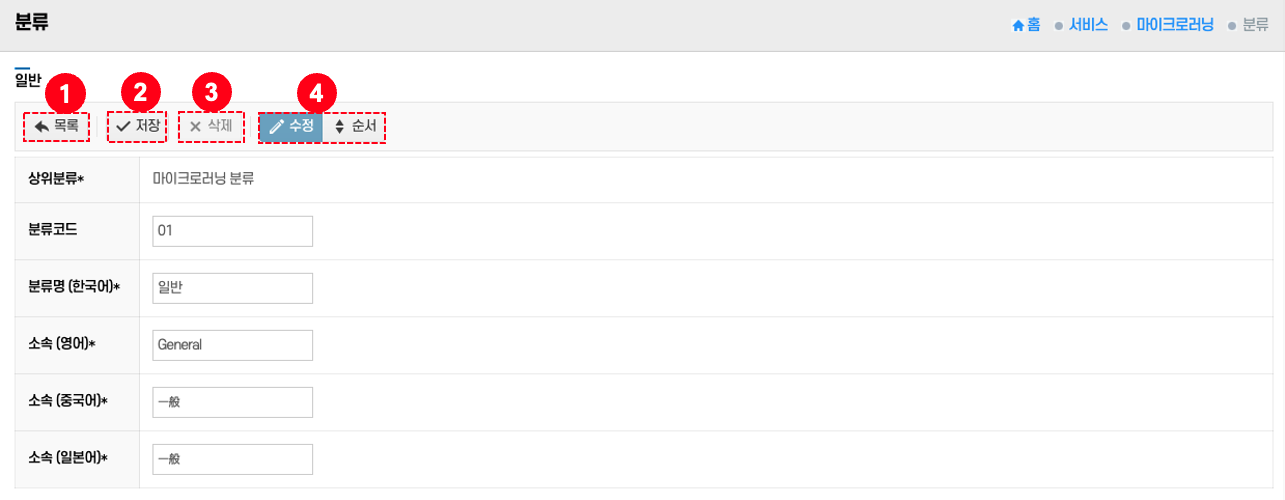 - 저장: 변경한 내용을 반영하려면 저장 버튼② 클릭 → 분류 정보가 저장된다.