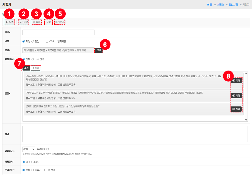• 삭제(문항): 필요 없는 문항을 삭제하려면 해당 문항의 삭제 버튼⑧ 클릭 → 문항이 시험지에서 제거된다.