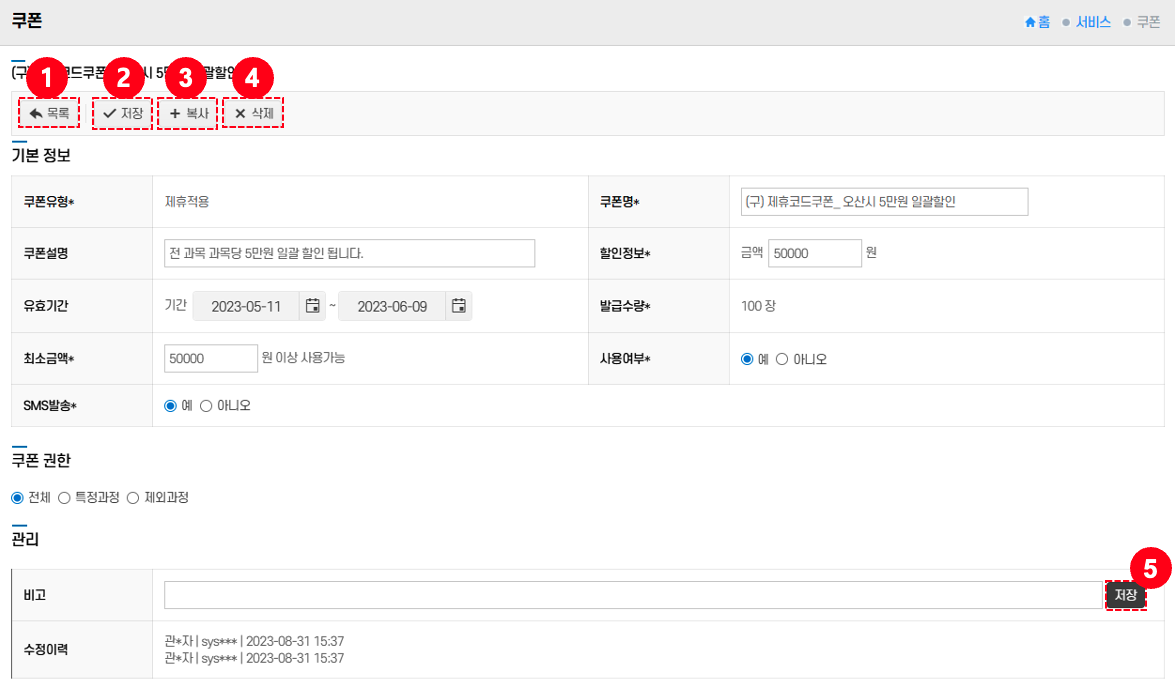 - 복사: 기존 쿠폰을 복제하려면 복사 버튼③ 클릭 → 동일한 설정값을 가진 새 쿠폰이 생성된다.