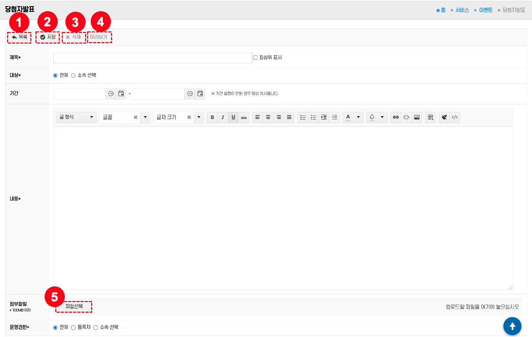 - 저장: 제목과 내용을 입력 후 저장 버튼② 클릭 → 신규 당첨자 발표가 저장된다.
