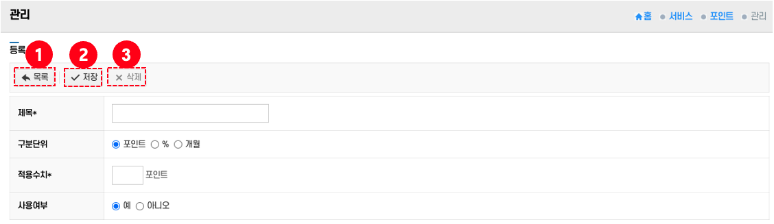 - 삭제: 현재 작성된 포인트 정책이 필요 없을 경우 삭제 버튼 ③ 클릭 → 해당 정책이 제거된다.
