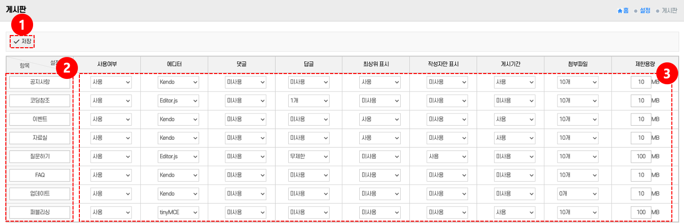 - 게시판 설정: 선택한 게시판의 설정 옵션 ③에서 사용 여부, 에디터, 댓글/답글, 첨부파일 제한 등을 지정한다.