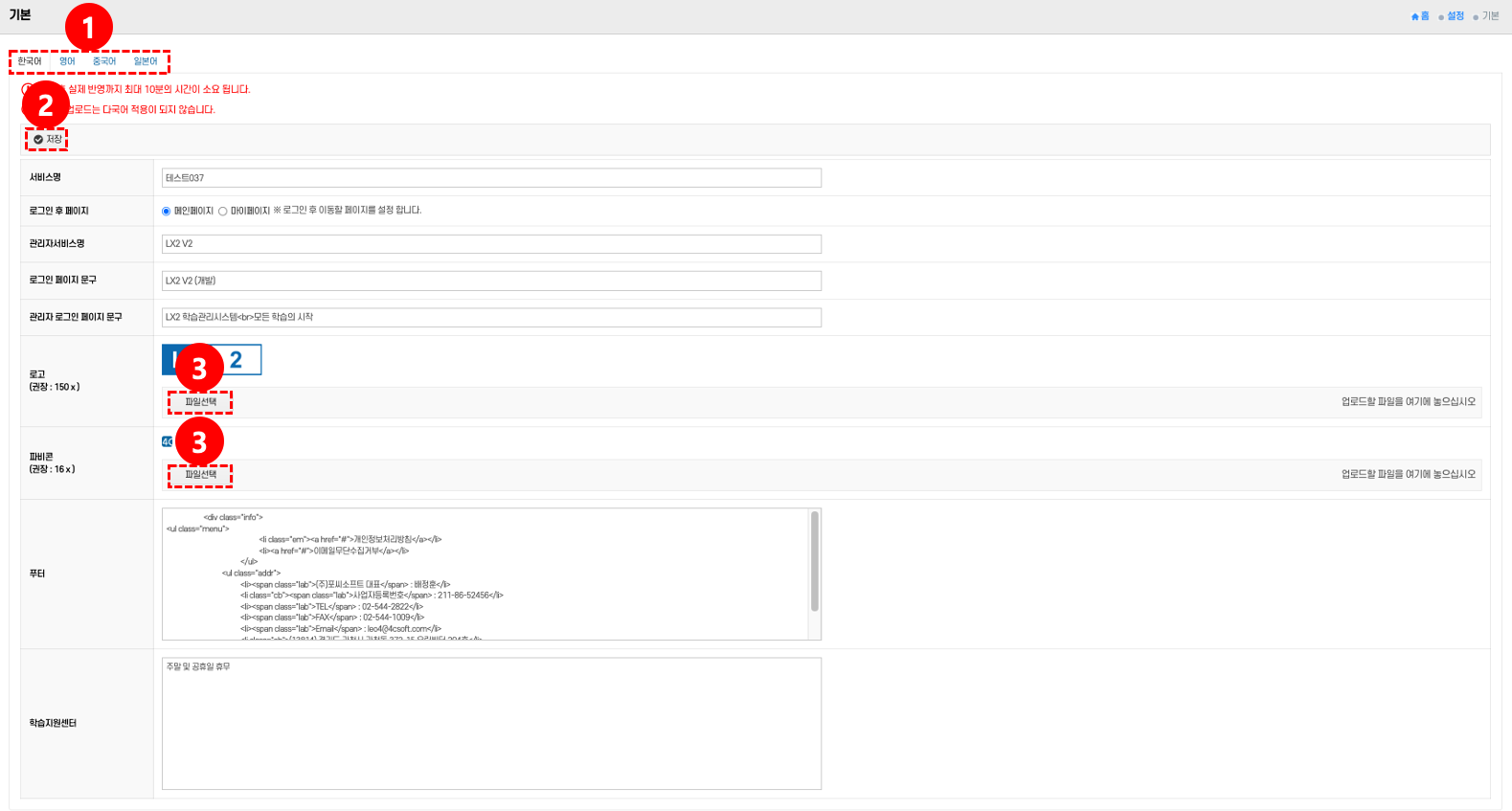 - 저장: 저장 버튼 ②을 클릭하면 서비스명, 로그인 페이지 문구, 로고, 푸터 등을 입력 또는 수정 → 저장 버튼 클릭 → 변경사항 반영된다. -파일 선택: 파일 선택 버튼 ③을 클릭하면 로고 또는 파비콘 업로드 영역에서 파일선택 버튼 클릭 → 로컬 PC에서 이미지 선택 → 적용이 완료된다.