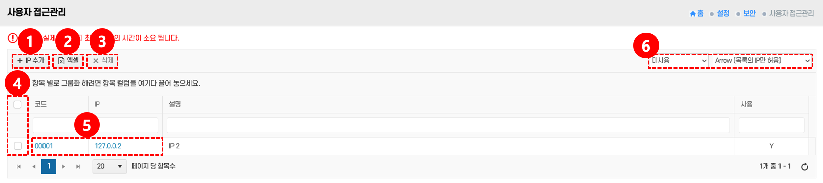 - 사용 여부: 드롭다운에서 사용 여부 ⑥ 선택 → 해당 IP의 접근 가능 상태를 설정한다.