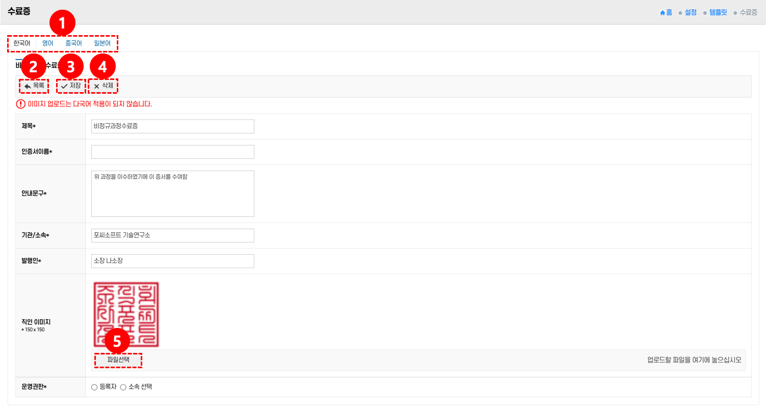 - 기관 직인 이미지를 업로드하여 수료증에 표시한다.
