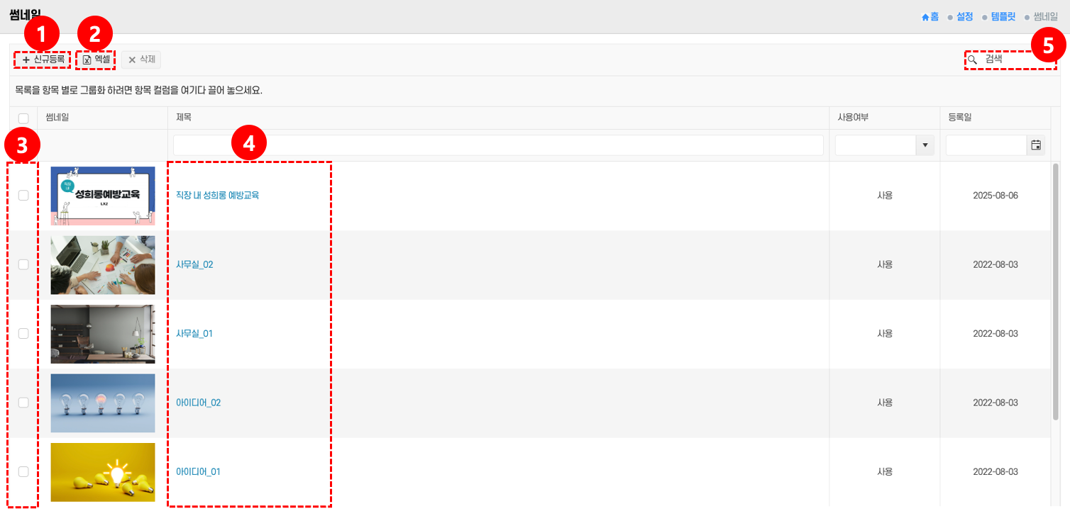 - 검색: 특정 썸네일을 찾으려면 검색창 ⑤에 키워드를 입력 후 검색 버튼을 클릭한다.