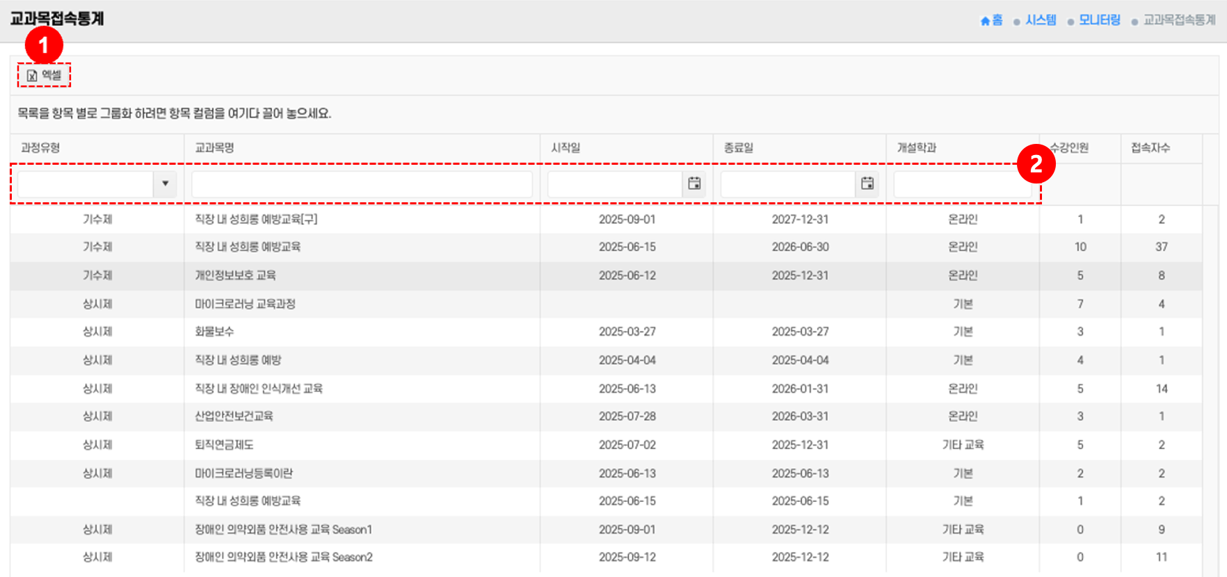 - 조회된 교과목별 접속 통계 데이터를 엑셀 파일로 내려받는다.