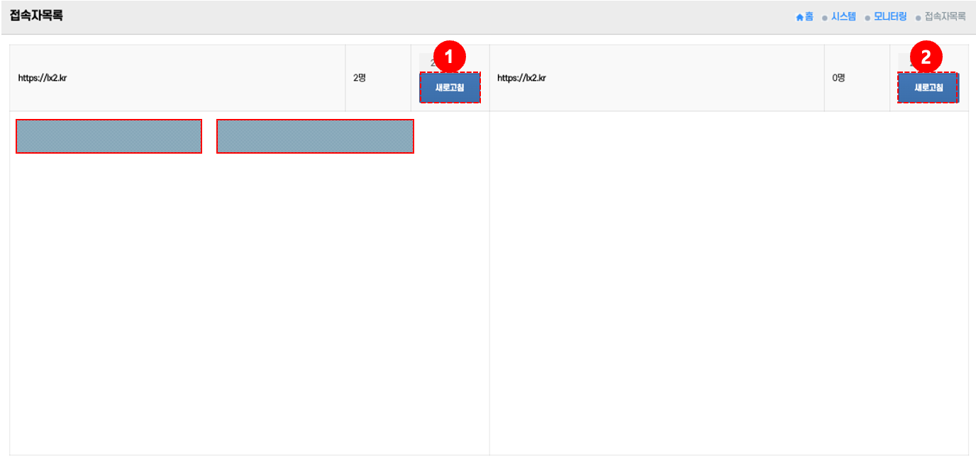 - 새로고침: 상단의 새로고침 버튼 ①, ②를 클릭 → 접속자 정보를 최신 상태로 갱신한다.