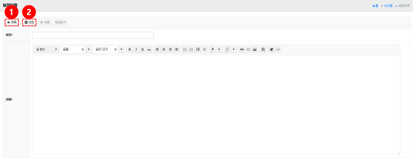 • 저장: 버전명과 내용을 작성한 후 저장 버튼 ②을 클릭 → 새로운 버전이력이 등록된다.