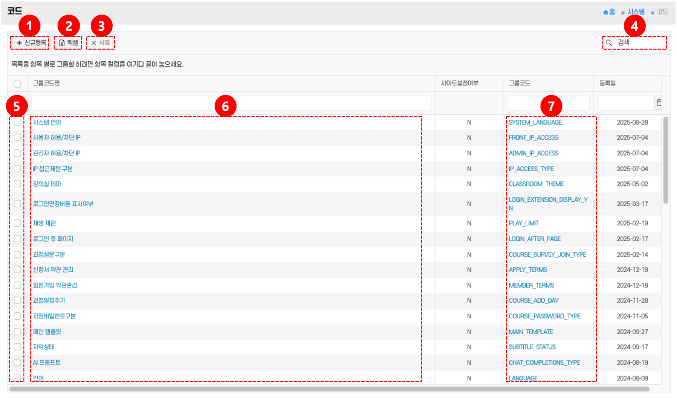 - 삭제: 불필요한 코드를 체크박스 ⑤로 선택 후 삭제 버튼 ③ 클릭한다.