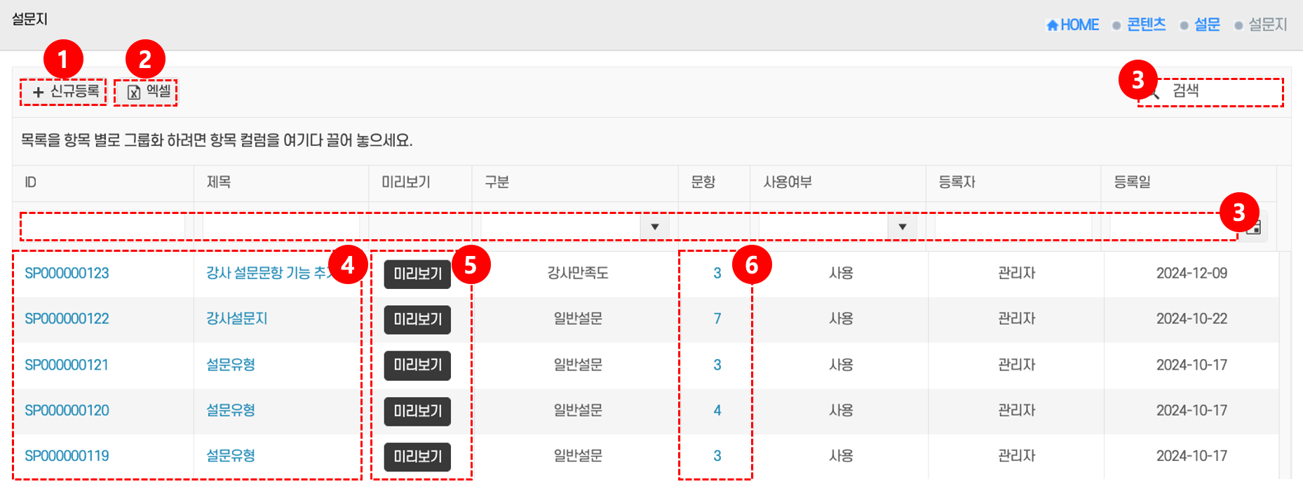 - 문항 관리: 특정 설문지의 문항을 관리하려면 문항 버튼 ⑥을 클릭 → 문항 추가, 수정, 삭제 기능을 수행합니다.