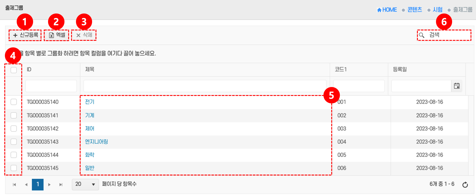 - 검색: 상단의 검색창 ⑥에 ID, 제목 등을 입력 → 조회 버튼 클릭 → 원하는 출제그룹을 찾는다.