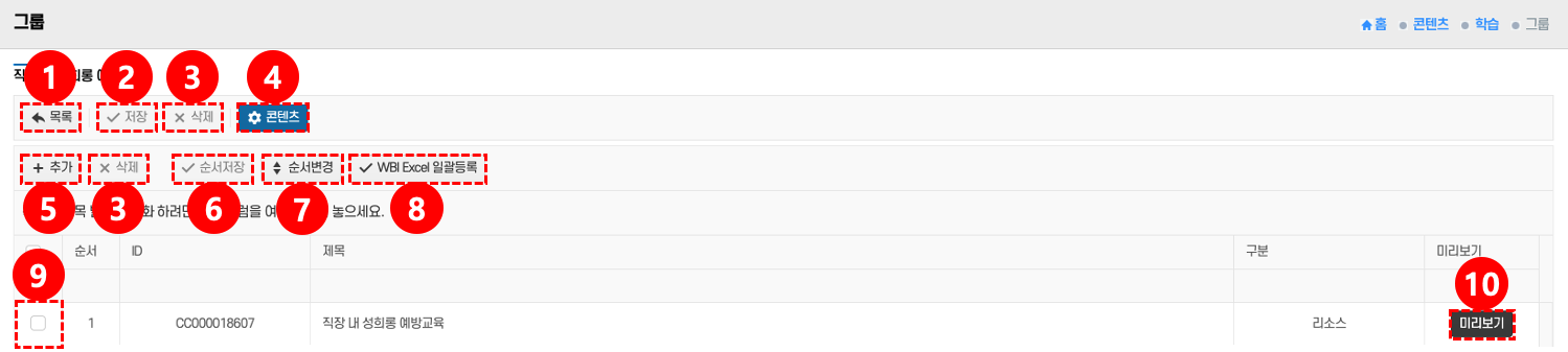 - 콘텐츠: 콘텐츠 버튼 ④ 클릭 → 그룹에 연결된 콘텐츠를 등록/관리한다.
