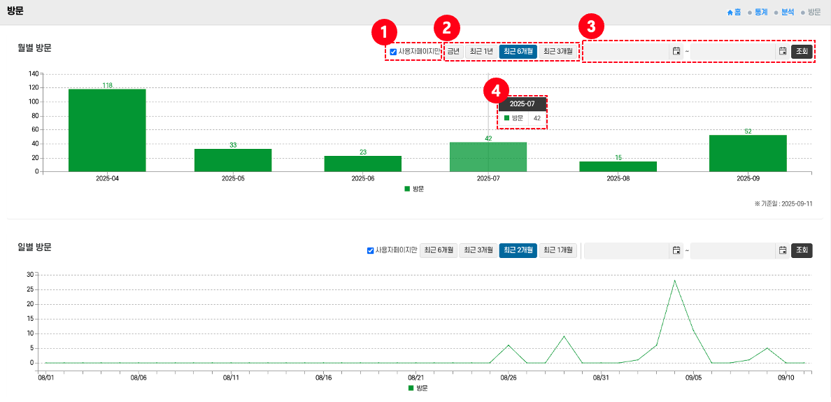 - 기간 설정: 시작월·종료월 입력 후 조회 버튼 ③ 클릭 → 선택 기간의 방문 수 확인이 가능하다.