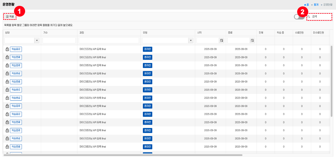 - 엑셀 다운로드: 상단의 엑셀 버튼 ① 클릭 → 현재 운영현황 데이터를 파일로 저장한다.