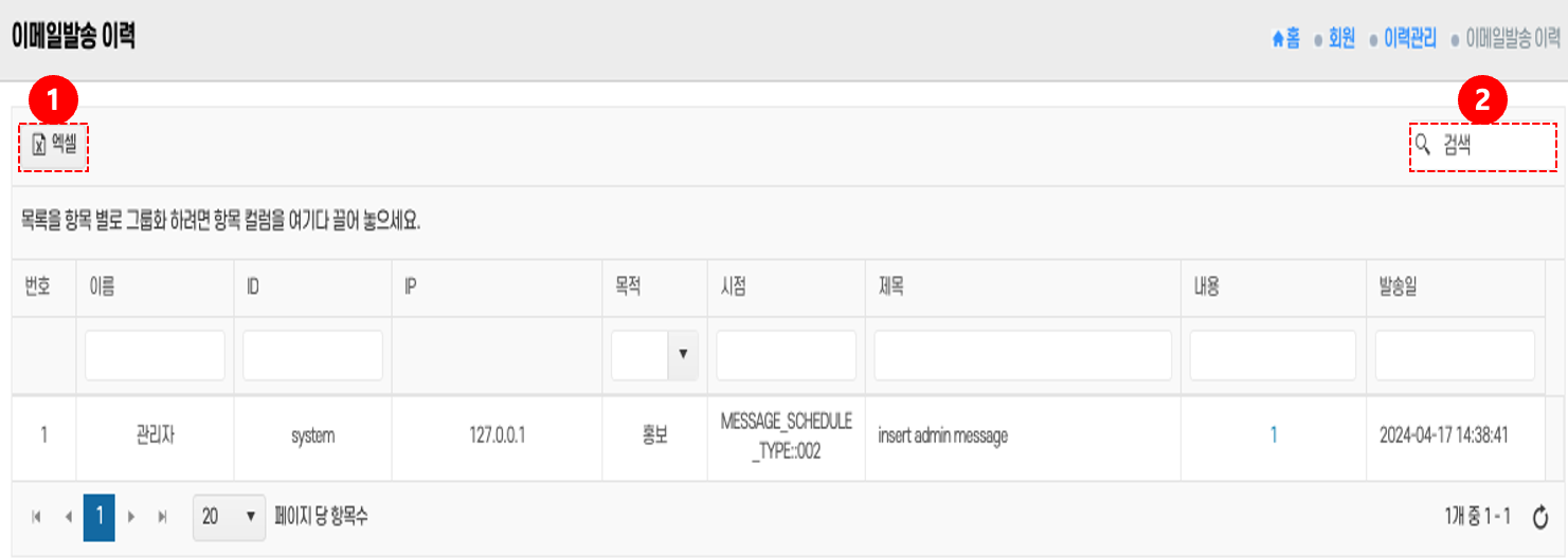 • 엑셀 다운로드: 상단의 엑셀 버튼 ①을 클릭 → 이메일 발송 이력을 저장한다.