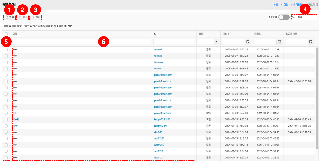 - 복구: 체크박스 ②로 회원 선택 → 복구 버튼 클릭 → 계정을 정상 상태로 복원한다.
