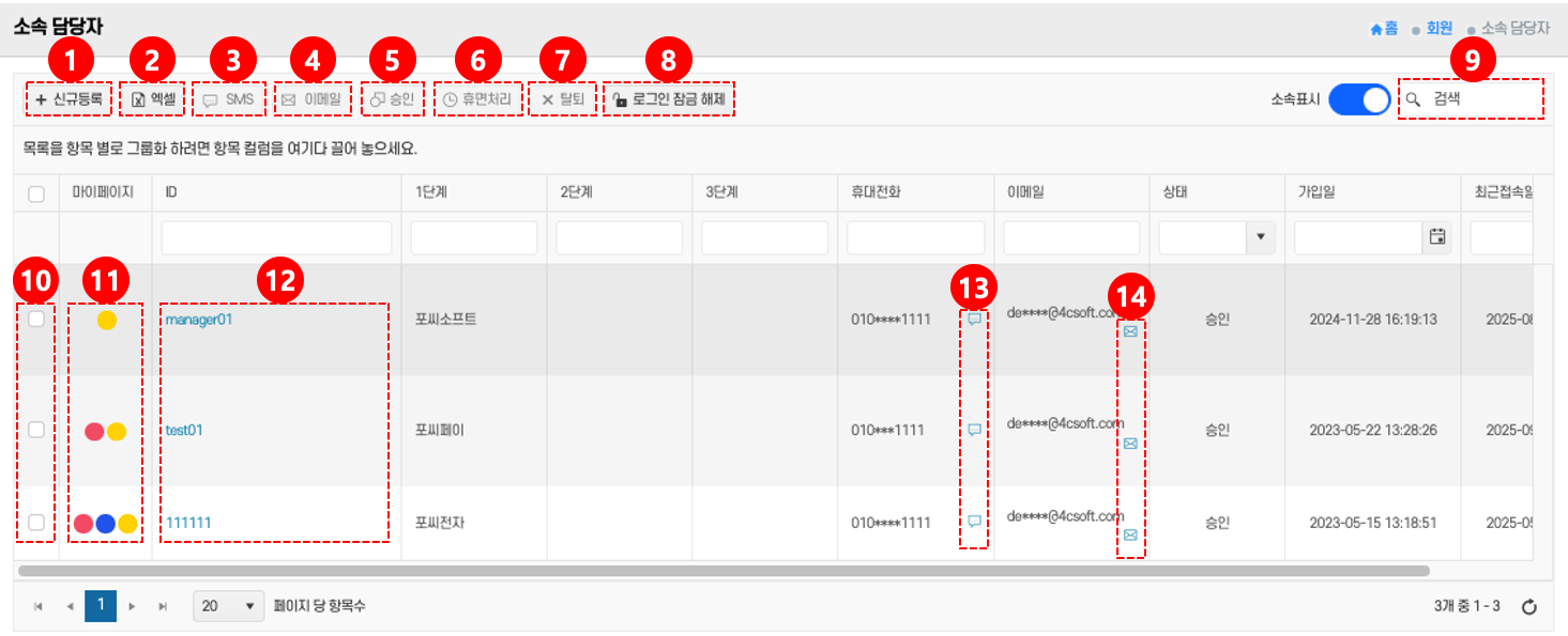 - 엑셀 다운로드: 상단의 엑셀 버튼 ② 클릭 → 담당자 목록을 엑셀로 저장한다.