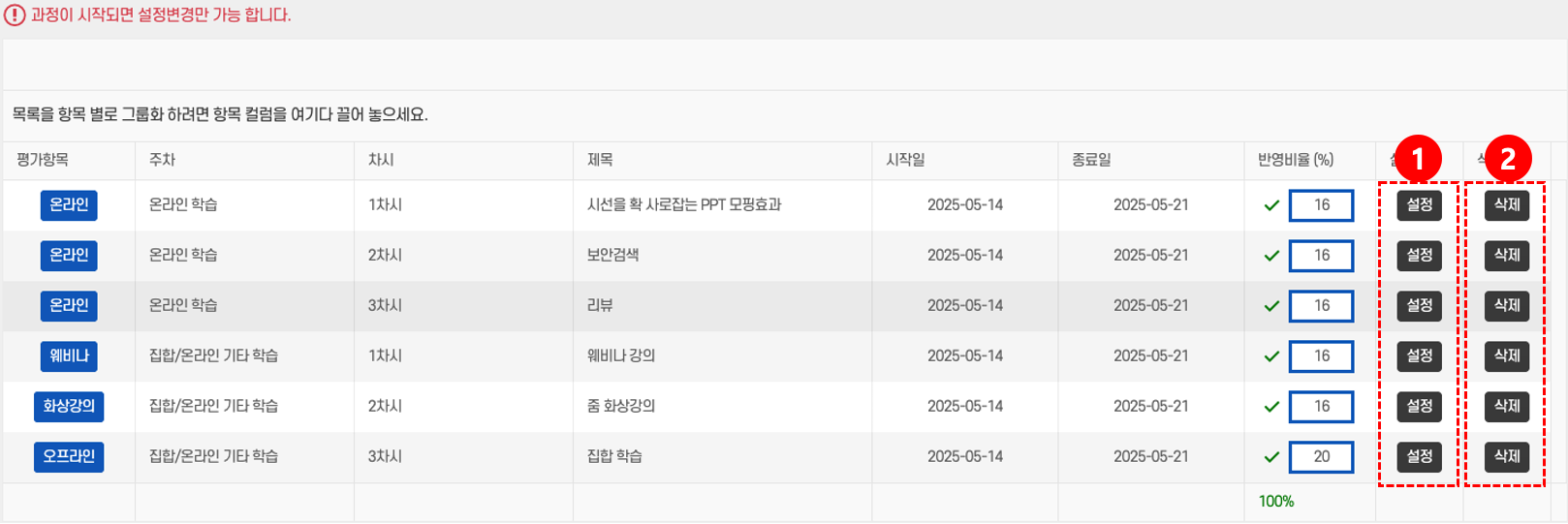 • 삭제: 필요 없는 차시를 제거하려면 삭제 버튼② 을 클릭하고 확인 창에서 ‘확인’을 선택한다.