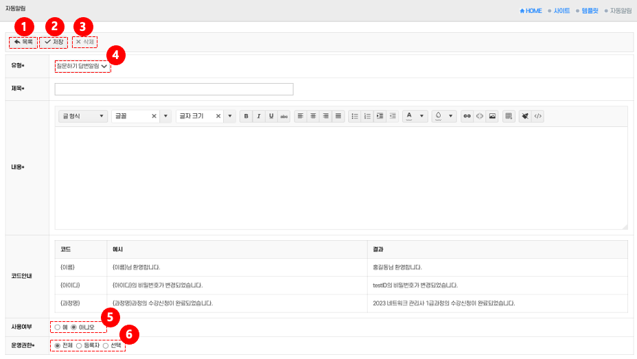 사용여부 설정: 사용여부 옵션 ④를 선택 → 발송 여부를 지정한다.