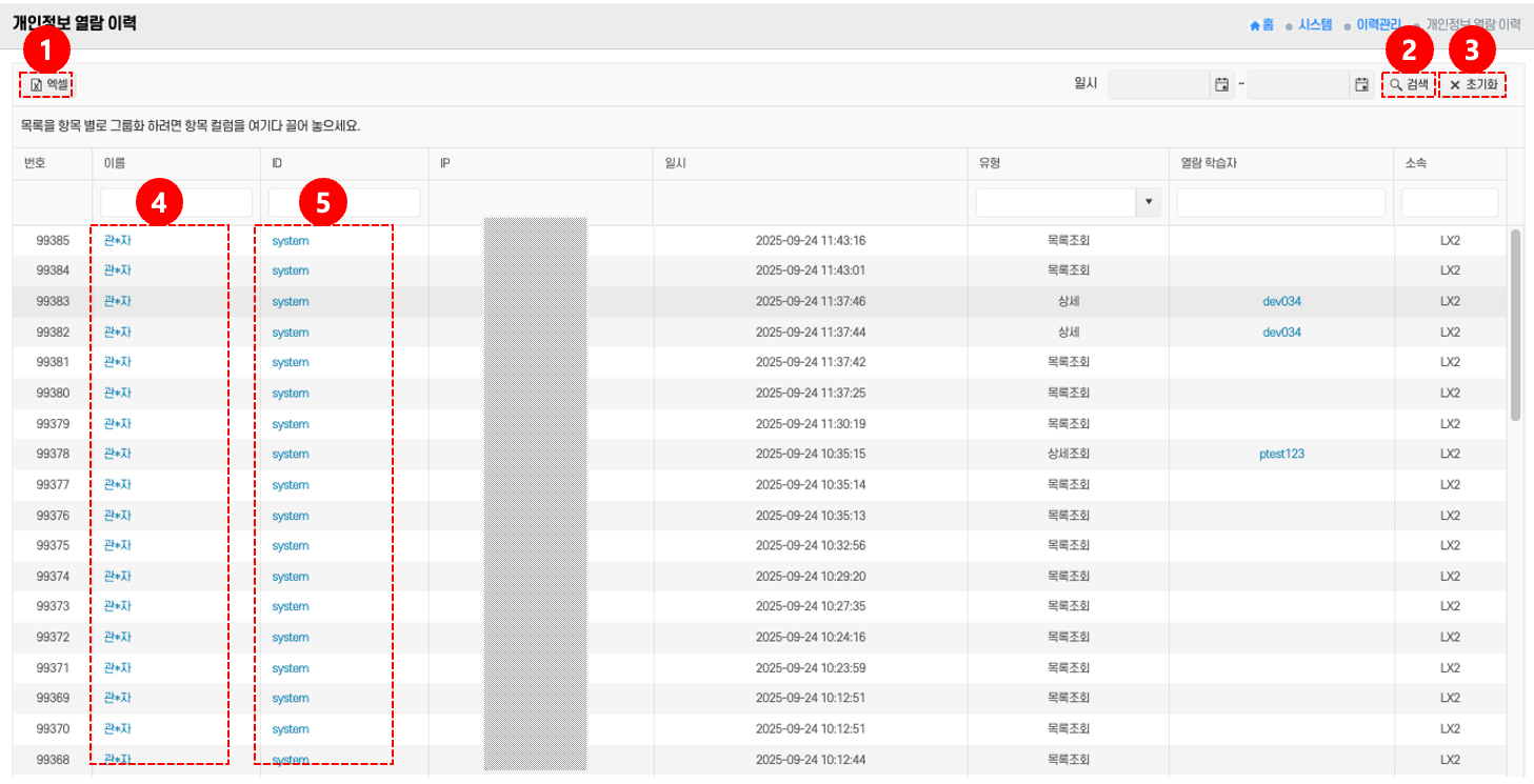 - 이름/ID 확인: 열람한 관리자의 이름 ④과 ID ⑤ 열을 통해 사용자를 식별할 수 있다.