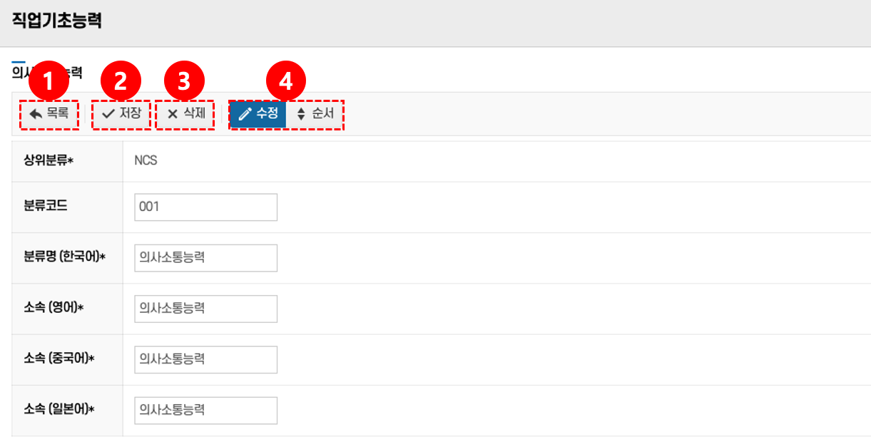 • 삭제: 해당 직업기초능력을 제거하려면 삭제 버튼 ③ 클릭한다.