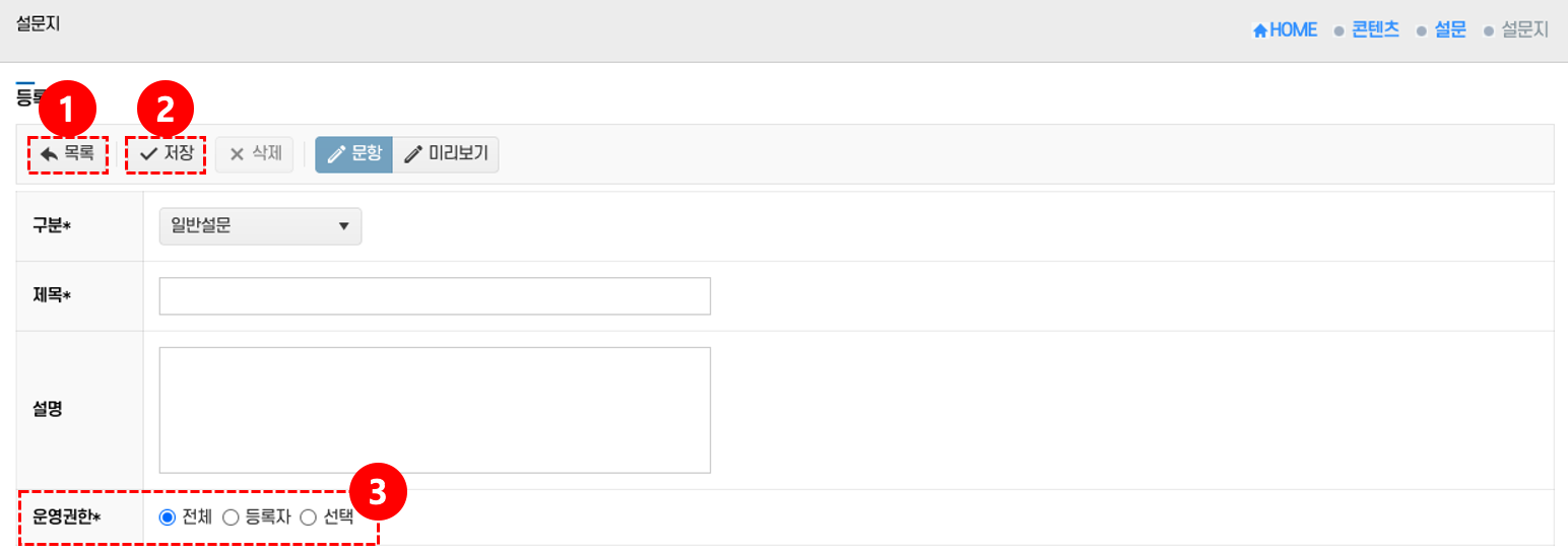 - 저장: 입력한 설문지 정보를 저장하려면 저장 버튼 ②를 클릭한다.