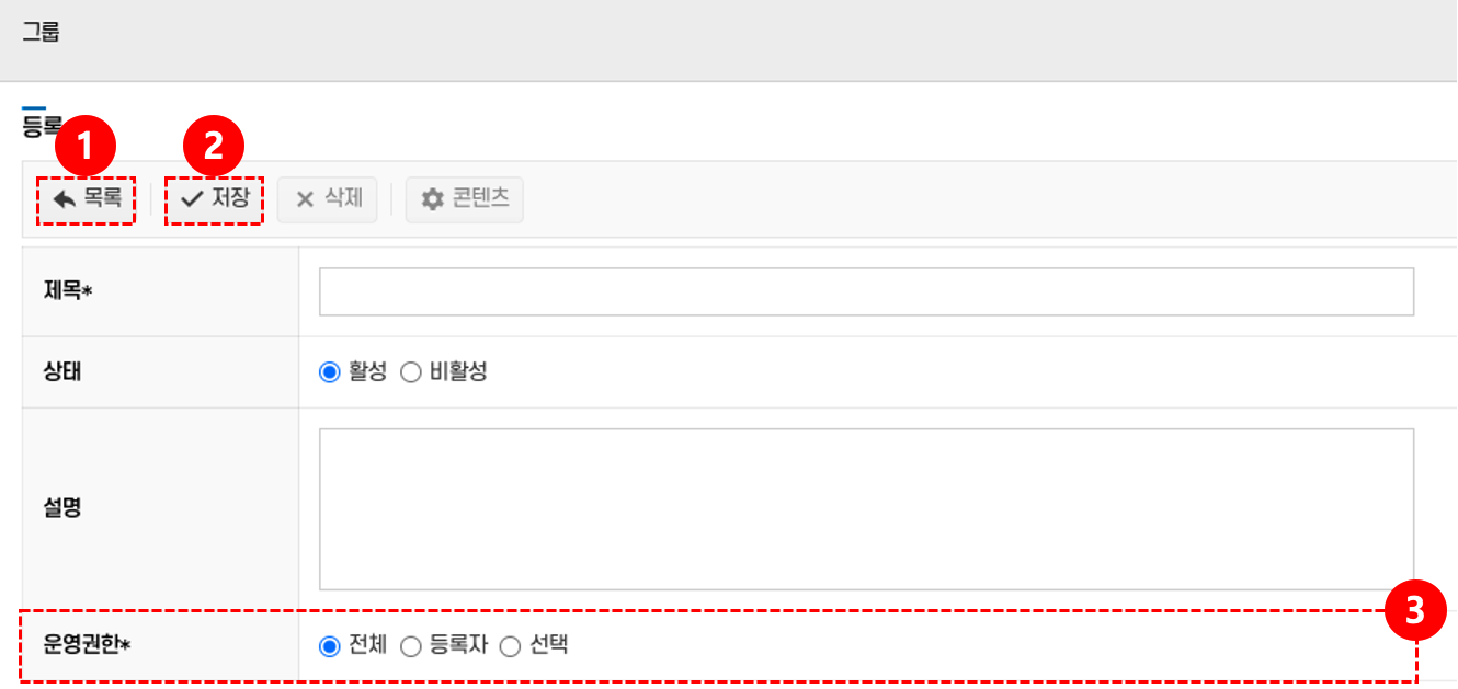- 운영권한 설정: 하단의 운영권한 옵션 ③에서 전체/등록자/선택 중 하나를 지정하여 그룹 운영 권한을 설정한다.